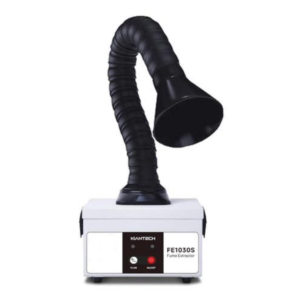 The KianTech FE1030S Fume Extractor is a compact, high-efficiency smoke extraction unit designed for soldering stations, laser workbenches, nail salons, and similar indoor environments generating harmful fumes and gases. It features a built-in filtration system (including activated carbon and HEPA or equivalent layers) that claims to remove particulate matter down to 0.3 µm with ~99.97% efficiency.